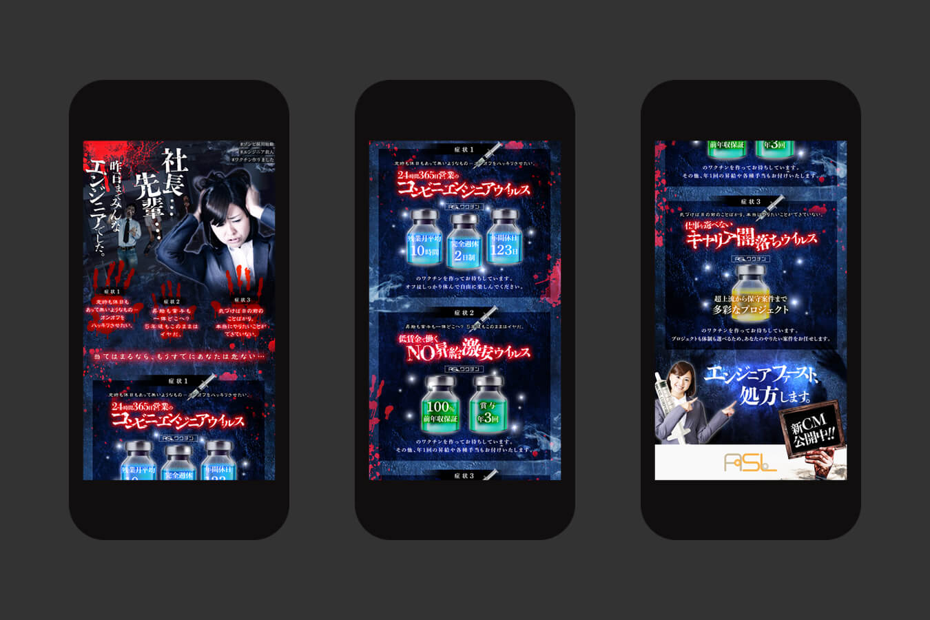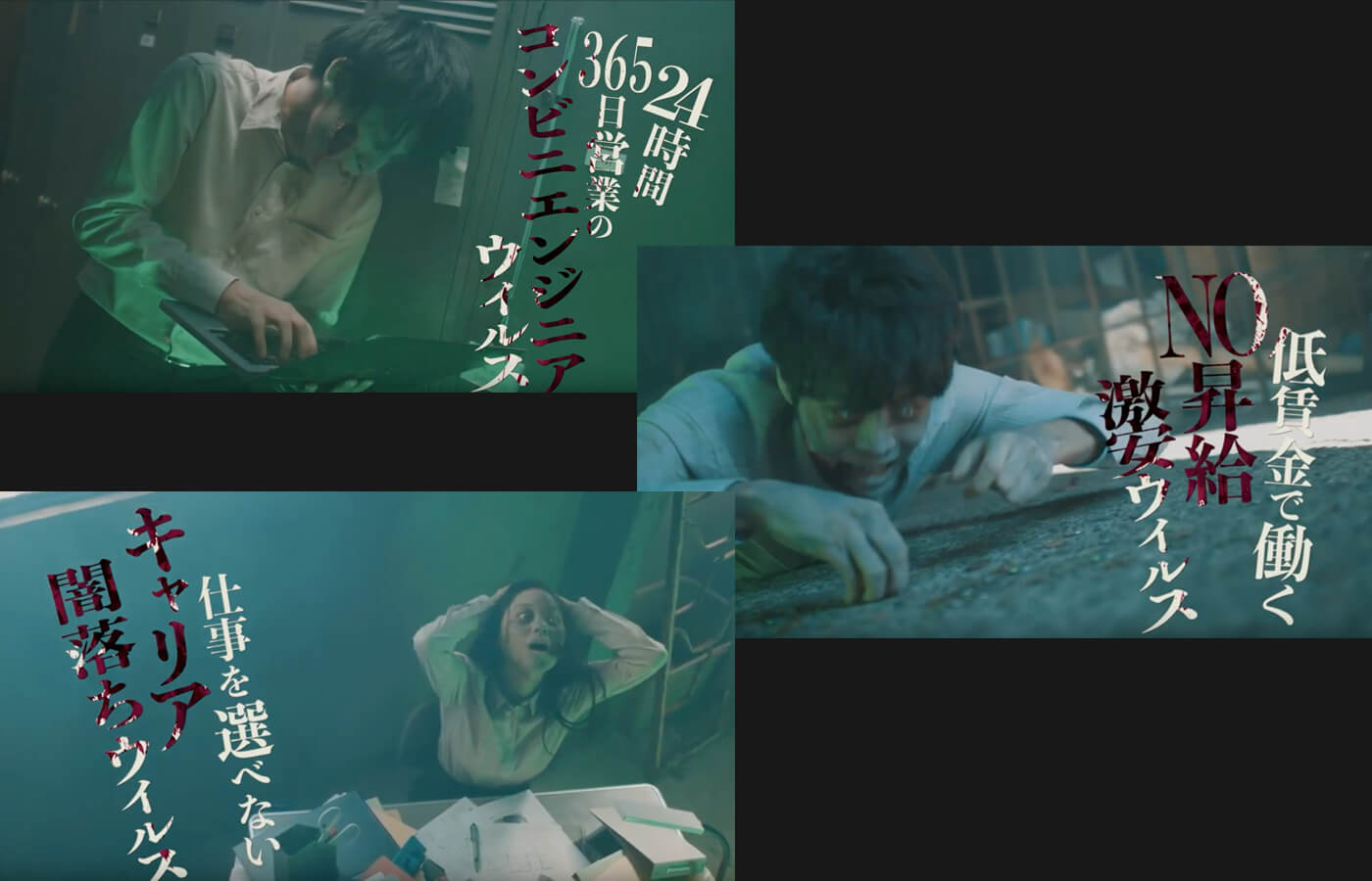 「休みも無く、休日出勤が当たり前」「低賃金で昇給も無い」「自分の好きな案件が選べない」など、エンジニアの転職理由を『旧型社畜ウイルス』とし、感染者がゾンビになるというキャッチーなストーリーで訴求効果を高めました。