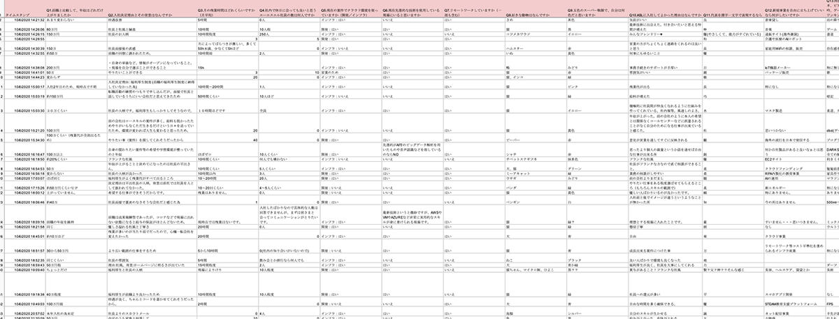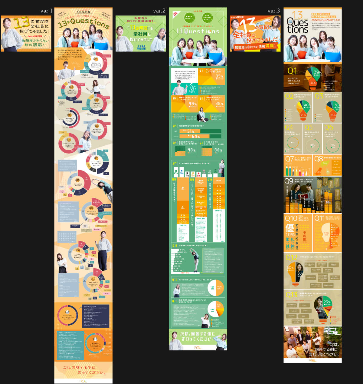エーエスエル様が発行されている社内報を取材時に見せてもらったところ、社内アンケートでのユニークな回答が多く、社員さんたちの人柄がリアルに伝わってきました。これだけノリが良ければ、求職者が知りたいことにも回答してくれて、読み応えのある【社内報・求人広告版】が作れるであろうというのが企画の意図。求職者が知りたい事柄やエーエスエル様の雰囲気が伝わる事柄を13の項目にまとめ、回答をお願いしました。