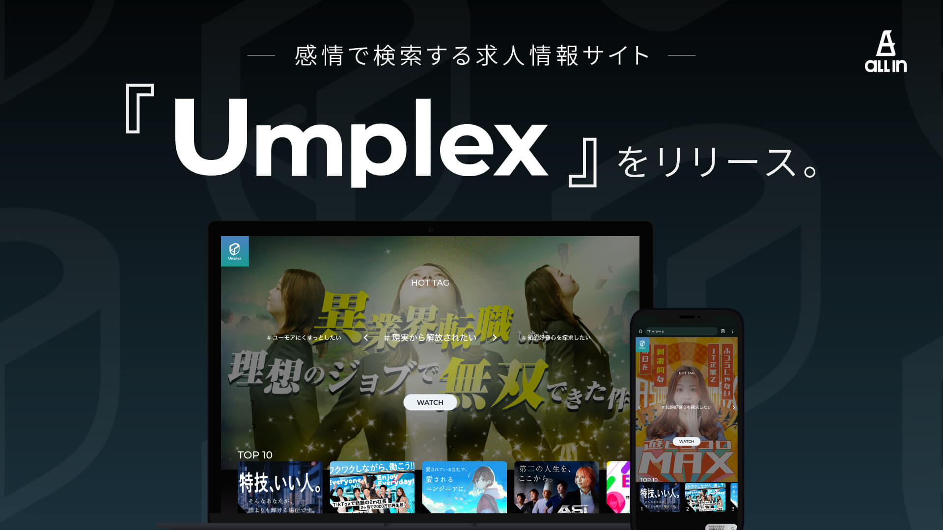 オールインはこの度、感情で検索する中途向けの求人情報サイト『Umplex(アンプレックス)』をリリースしました。