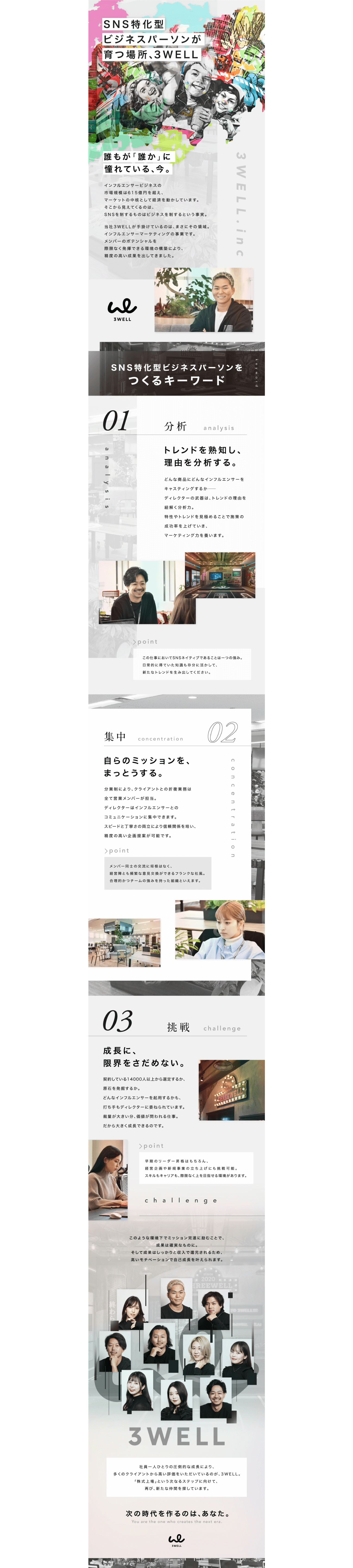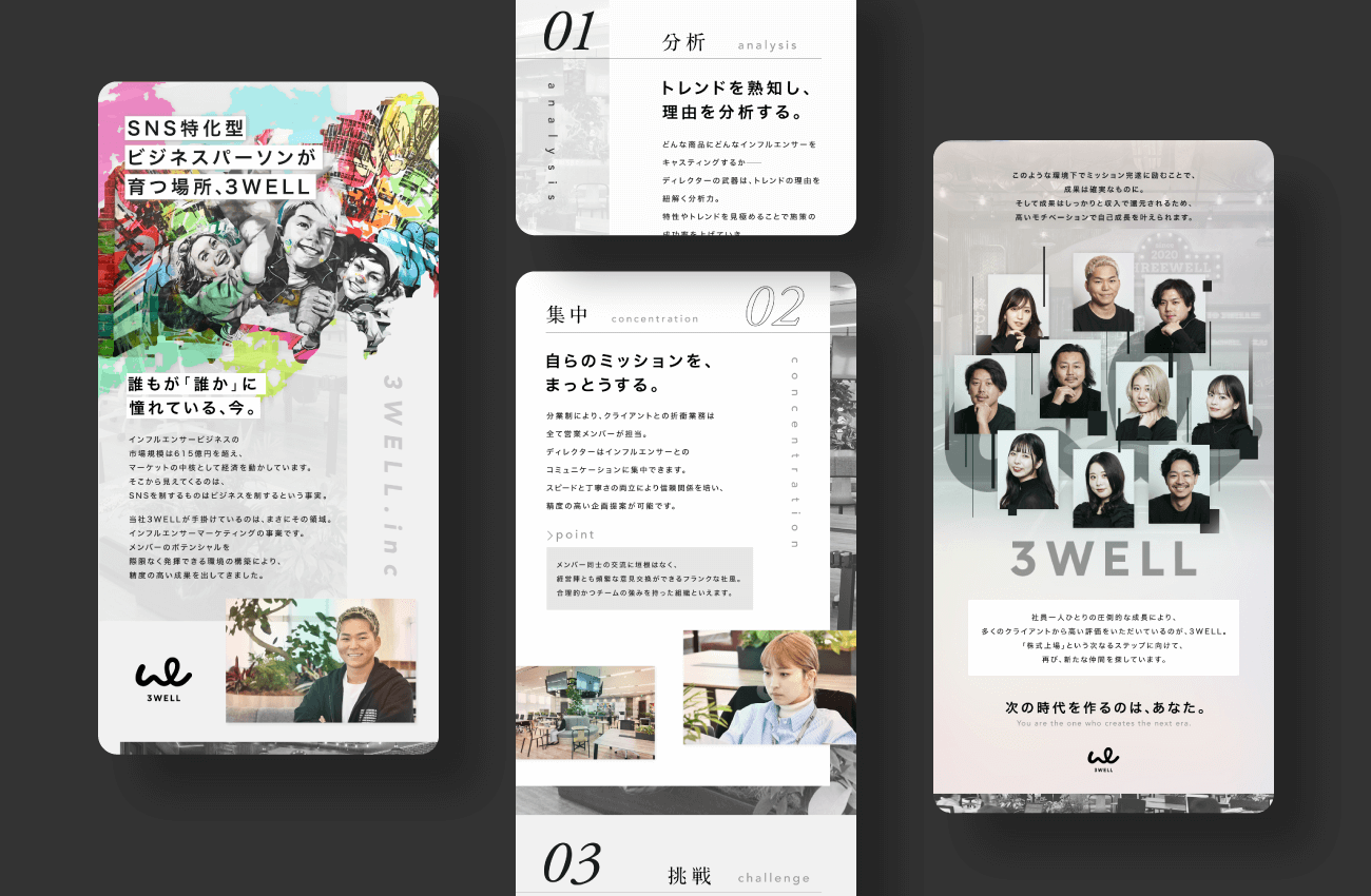 その市場規模は615億円。SNSはいまや若者の流行発信源にとどまらず、社会を動かすインフラとして市場の中核を担っています。今回ご紹介するのは、そんなSNSを活用したインフルエンサーマーケティングのプロとしてクライアントから高い評価を受けている3WELL様の事例。華やかな業界だからこそイメージ先行によるカジュアル応募が多く、企業成長をさらに加速させる「ビジネス思考を持った若手」の母集団形成にお悩みでした。同社の競合優位性は、14000人以上のインフルエンサーとの契約によりノウハウやコネクションを蓄積できている点。さらには業務に専念できる分業制を導入しているうえ、経営陣とも意見を交わしやすい風土があります。こうした事実をもとに、分析→集中→挑戦という成長サイクルを表現。同社を「自走力を持ったSNS特化型ビジネスパーソンが育つ場所」と定義し、採用ターゲットとのマッチングを図りました。