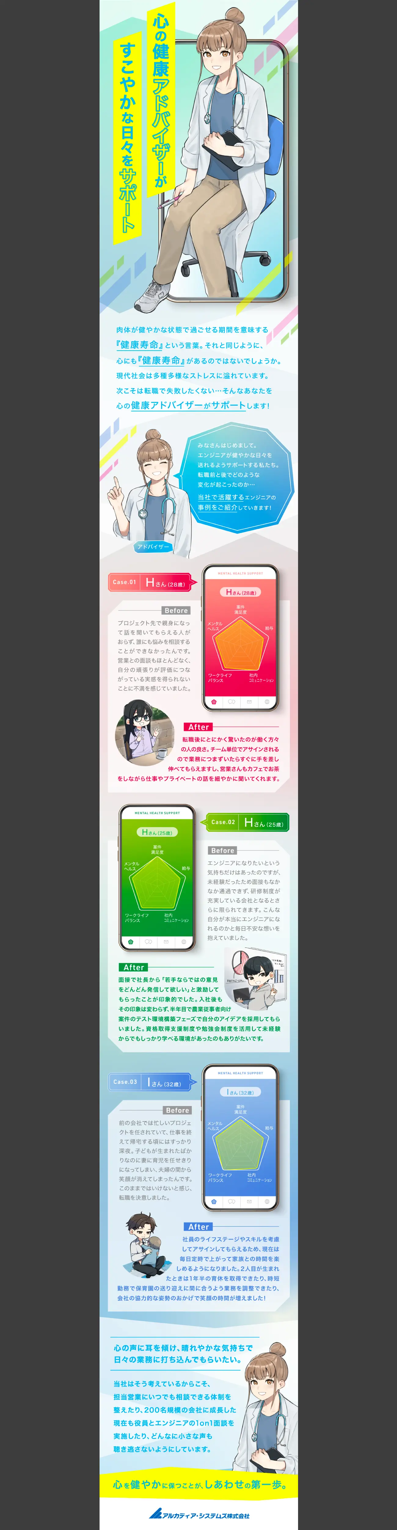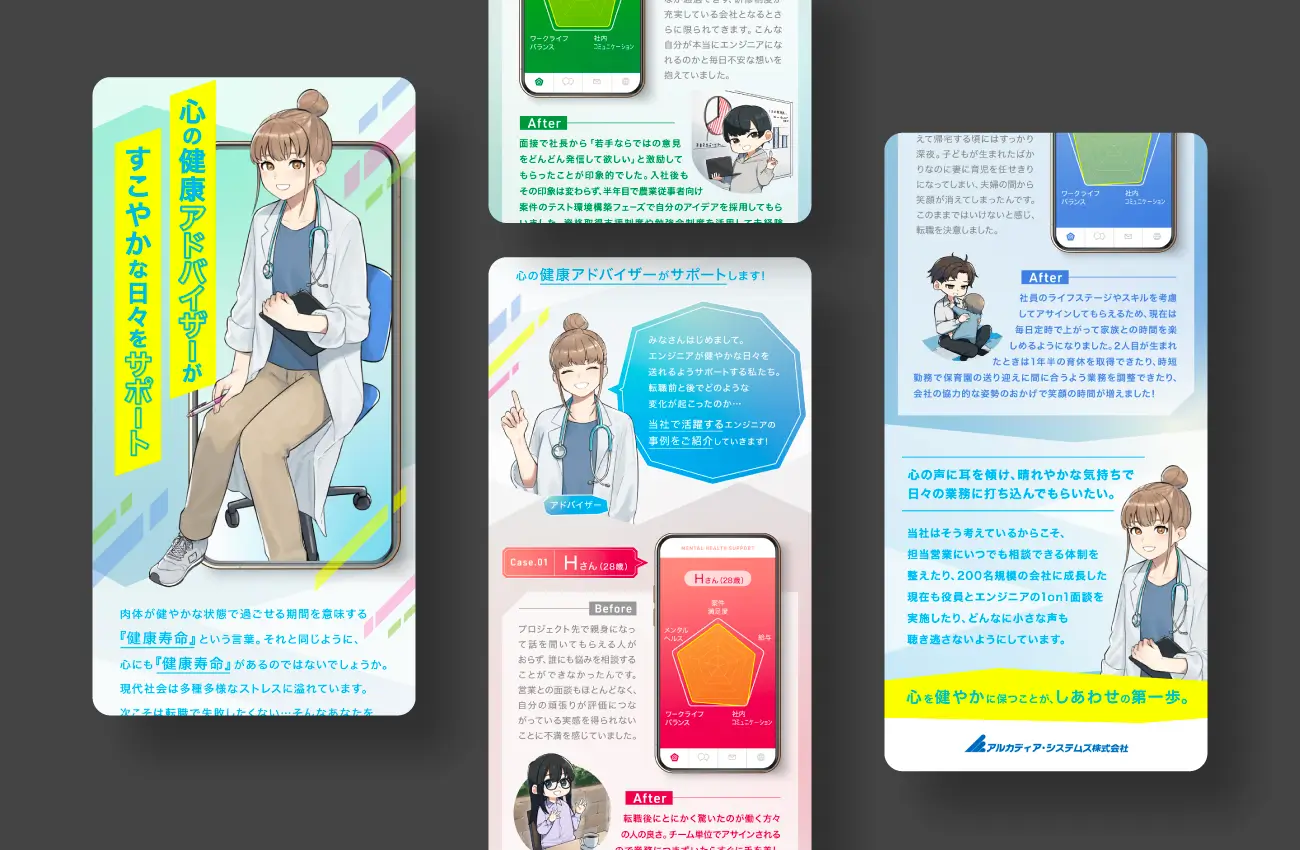 気持ちに寄り添ってくれる存在がいるという安心感を伝えるため、心の健康カウンセラーとして会社を擬人化したイラストをキービジュアルに据えました。さらにIT業界とのシナジーを生み出すため、心の健康を管理するアプリとして表現。やわらかなテイストの中にもビビッドな色合いを駆使することで、デジタル感を演出する狙いです。社員同士が互いを想い合うエピソードを年代・性別・キャリア別に紹介し、自分事として当てはめられる導線を形成しました。