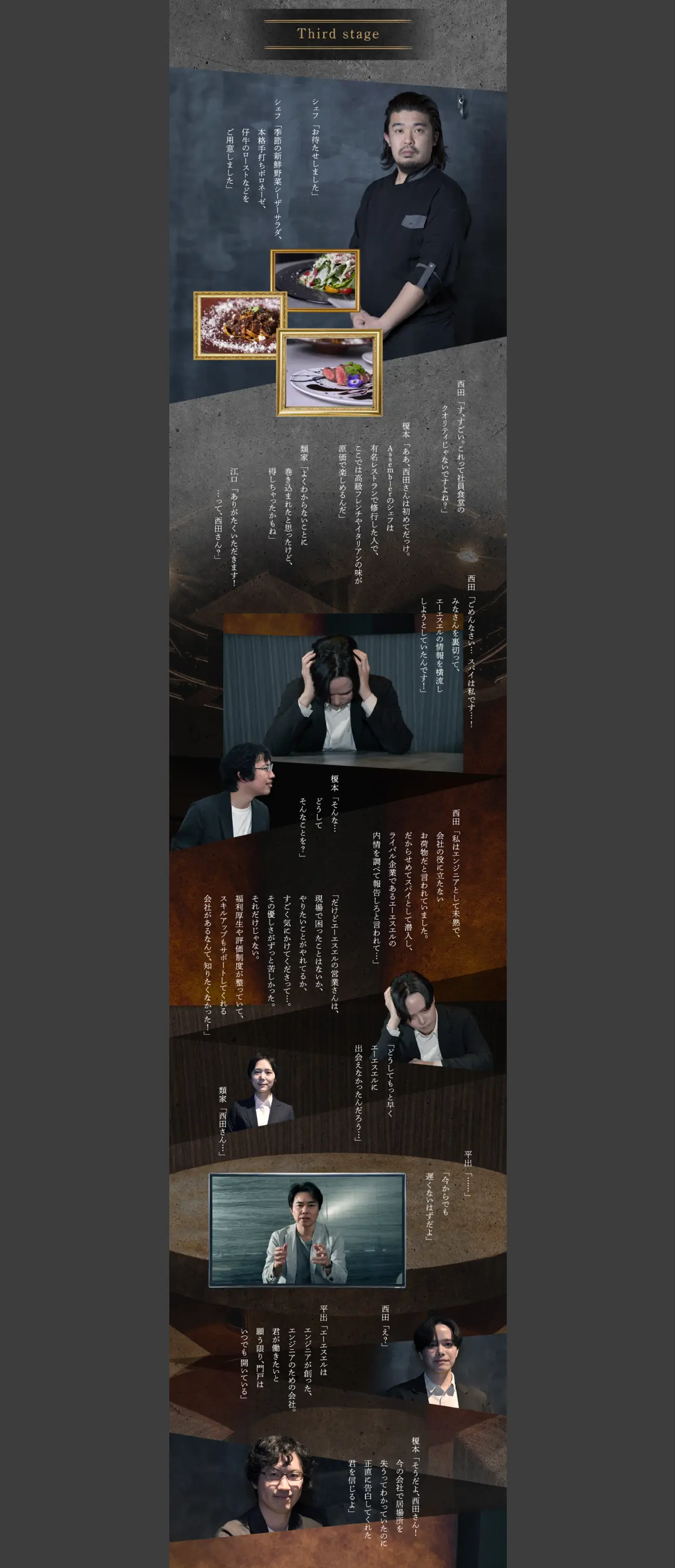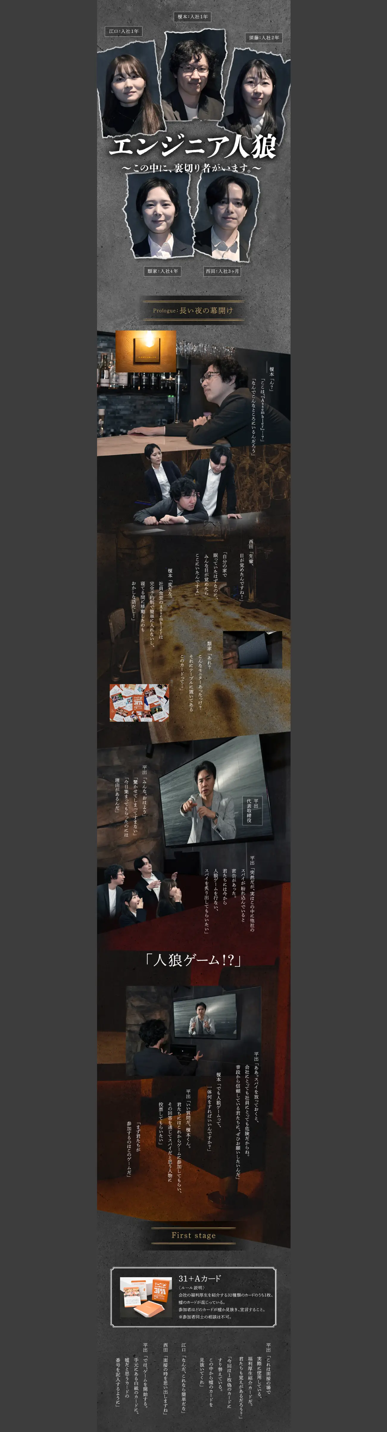 同社で働くエンジニアたちが見覚えのない廃墟で目覚め、顔を合わせるシーンから物語ははじまります。状況を飲み込めず戸惑っていると、館内放送で「ひとりだけ他社のスパイが紛れ込んでいる」と告げられます。本物の社員であれば、会社に関する質問に答えられるはず。魅力的な福利厚生や年収の上り幅など、質問を通じて求職者も自然とエーエスエル様の企業理解を深められるとともに、「いったい誰が人狼なんだろう?」というハラハラ感で最後までスクロールする手を止めさせません。最後に待つどんでん返しは、求人広告というより一本の映画のよう。エンジニアたちがどのような結末を迎えるか、ぜひその目でご覧になってみてください。