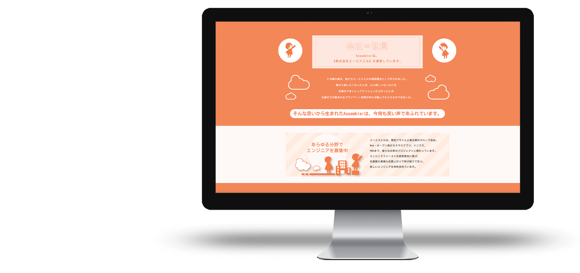 そしていよいよページのラストへ。洞窟の出口を抜けると、エーエスエル様の明るく親しみやすい、オレンジのコーポレートカラーが目に飛び込んできます。そこで初めて「実は会社の福利厚生でした」とネタバラシ。求職者の興味を掴んで離さないまま、エントリーにつなげる構成としました。