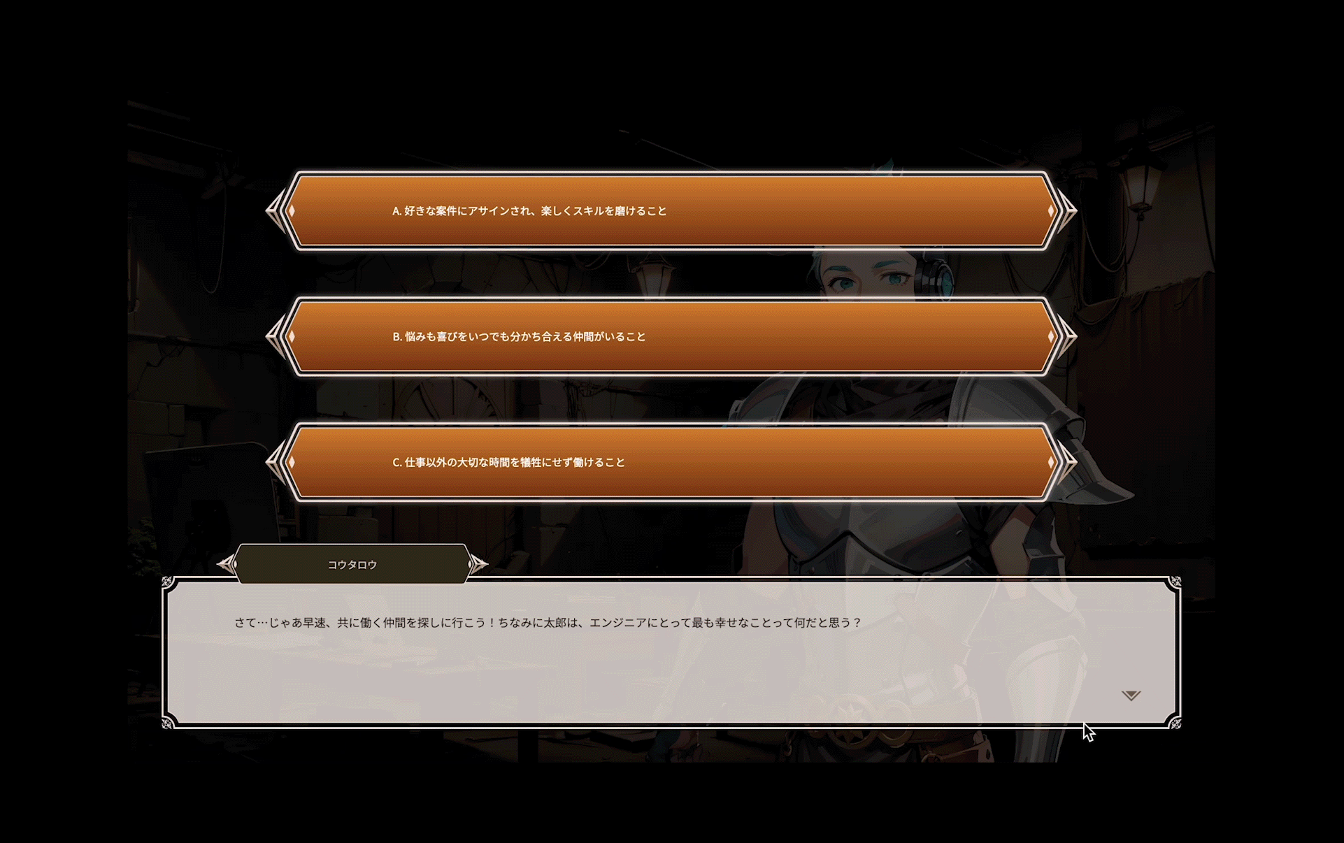 具体的なストーリーは、エーエスエルで働いていたエンジニアが異世界に転生し、そこで目の当たりにした劣悪な労働環境を元の世界の福利厚生にならって改革していく…というもの。1人称視点のノベルゲーム形式で進んでいき、プレイヤーが選択した内容によってエーエスエルとのマッチ度が診断できるという興味喚起を促すのに効果的なコンテンツとなっています。さらに、ストーリー上で入力・選択した経験やスキルなどの情報がラストの応募フォームに反映されているというサプライズも。ストーリーやギミックの面白さに加え、操作ストレスを極限まで減らしたプレイヤー目線のユーザビリティを実現しました。楽しみながら会社の魅力を理解し、応募までのアクションをシームレスに完了できる採用LPに仕上がっています。