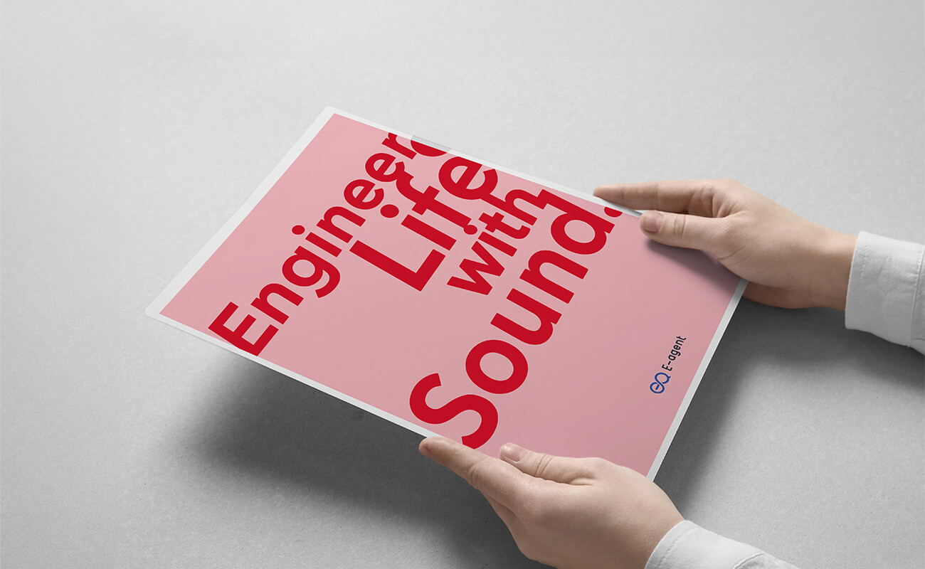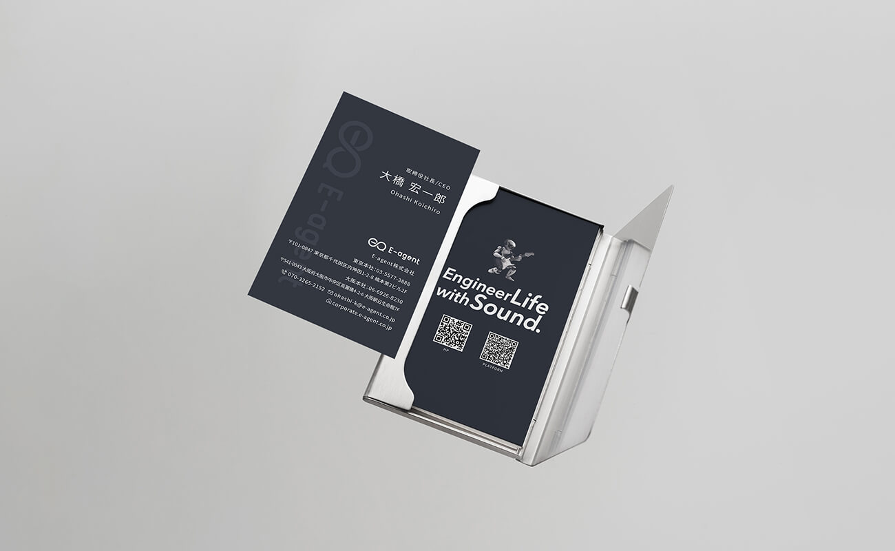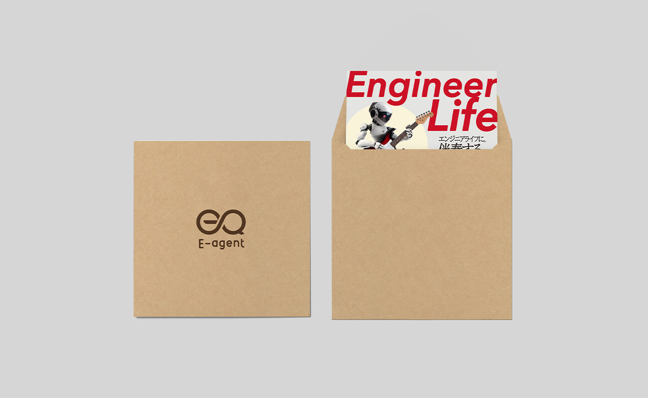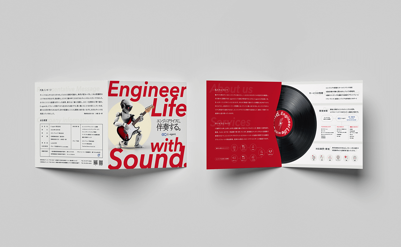 コーポレートサイトの完成後は、パンフレットの制作に着手しました。サイトの世界観と統一性を持たせつつ、紙媒体だからこそできる表現を模索。E-agent様のカギとなっている音楽という要素を加味した結果、レコードをモチーフにしました。さらには名刺やクリアファイル、封筒といったステーショナリーも制作。こちらは温かみのあるグレーを背景に敷くことで、「Engineer life with sound.」というキャッチコピーを際立たせています。