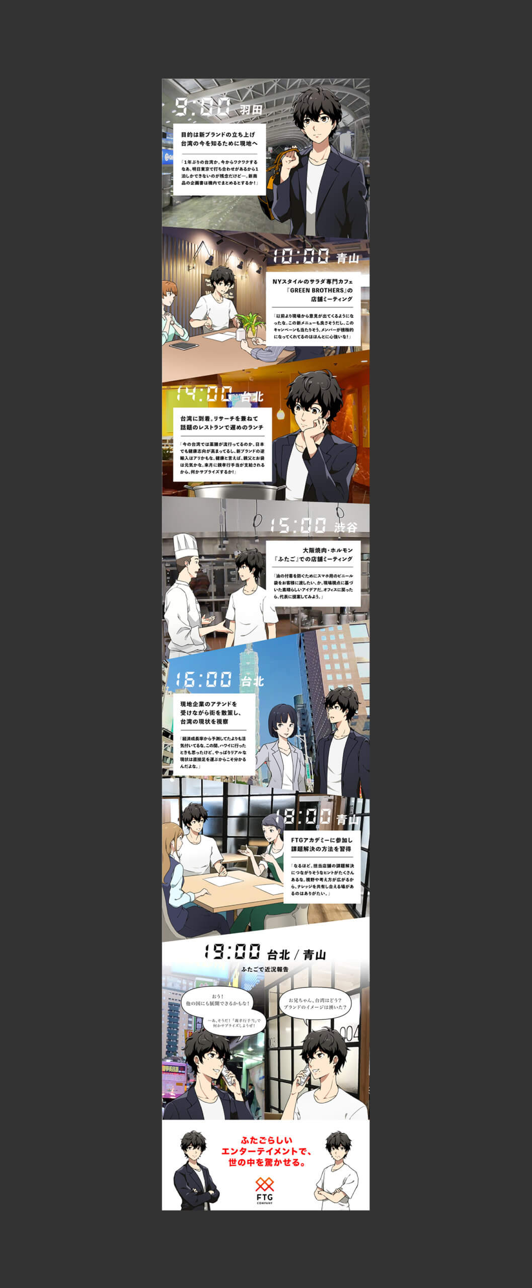 まずはバナー広告で、ある1日の流れがテーマであることを伝えます。遷移先のフリーページでは1日の流れを時系列で追い、国内と海外のシーンを交互に折り重ねました。「なぜ国内外を行き来できるの?」という違和感を与えるためです。その違和感は、ラストシーンの「一人の1日かと思いきや、ふたごの1日だった」というネタばらしにより、カタルシスに変わります。ふたごの髪型や黒子の位置などを微妙に変えているので、途中でカラクリに気付いた人もいるかもしれません。