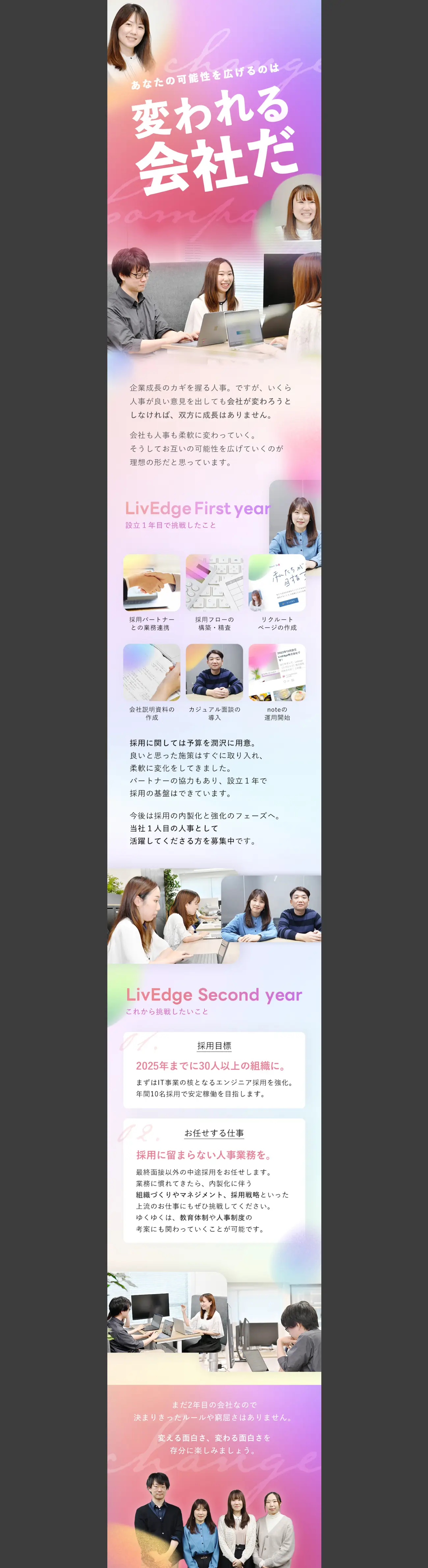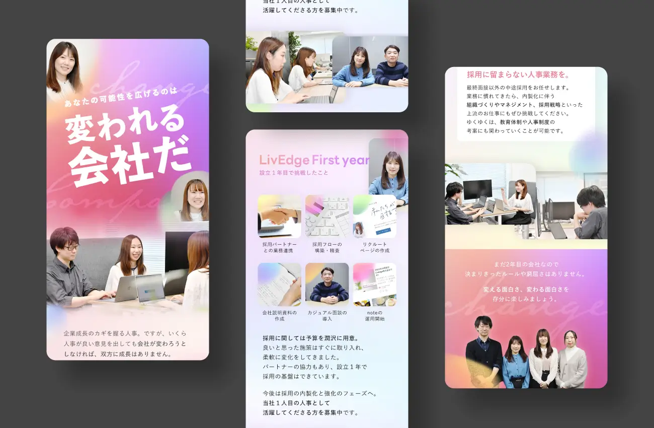 設立1年目の時点で、HP、リクルートページ、会社説明資料、採用広報が揃っているLivEdge様。この事実そのものが、採用への本気度や変化を恐れない文化を表すのに充分すぎる根拠だと考えました。このような変化の事例を具体的に記載することで、「ここでなら挑戦ができそう」という期待感を醸成。さらに、新しい人事と描きたい今後のビジョンも明確に語ることで、「一緒に成長していきたい」というメッセージ性も高めています。