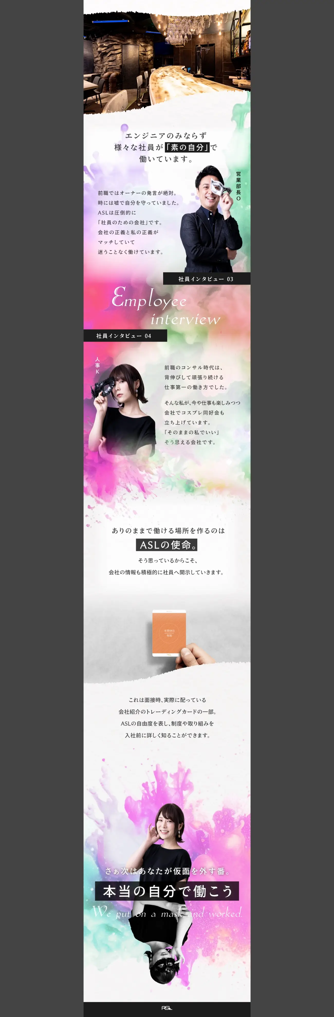 本格ゾンビ映画のような採用動画やトレーディングカード風の採用パンフレットなど、様々な採用施策を実行してきたエーエスエル様。今回の求人広告でも、エーエスエル様ならではの魅力とユニークさを同時に演出する必要がありました。そこでオールインは、自分を偽って薄暗い気持ちだった前職時代と、仮面を外して毎日に彩りができたエーエスエル様での日々を対比する表現・企画をご提案。求人広告では滅多に見かけない仮面を使用することでファーストビューのインパクトを出しつつ、「これまでは自分を偽って我慢していた」というターゲットに向けて「エーエスエルでは仮面を脱ぎ捨て、本音で楽しく働けること」を訴求する、企画としてのわかりやすさも狙いました。