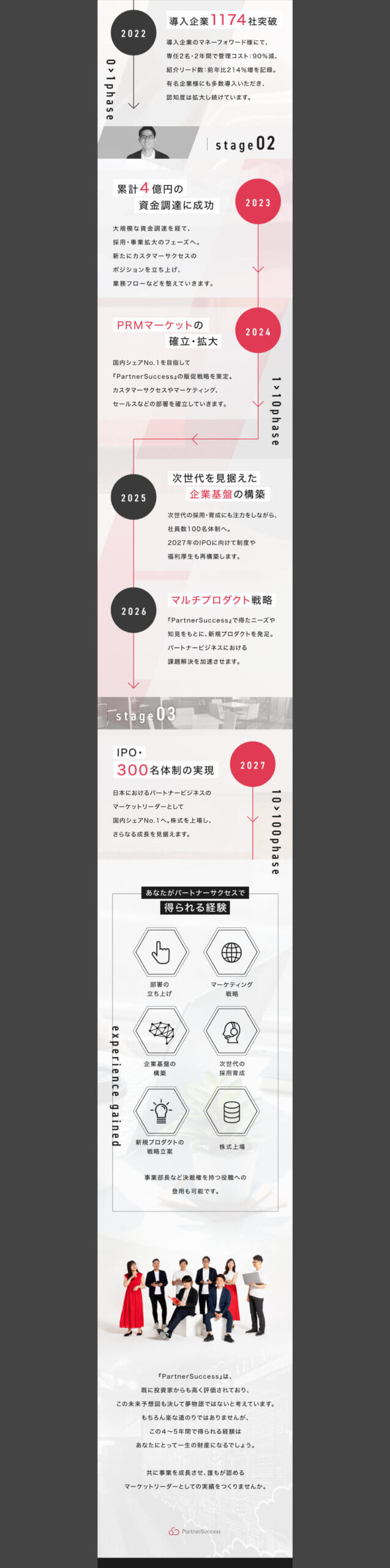 同社が手掛けるのは、日本ではまだ未開拓のPRM市場。新しいマーケットだからこそ、会社の魅力付けと可能性をしっかりと伝える必要がありました。冒頭ではPRM市場の期待値の高さ、提供サービスの魅力を提示。そのうえで、中盤では同社の成長戦略をわかりやすい図式で紹介しています。また、1年ごとに得られる経験を詳細に描いたことで、立ち上げ期の面白さと大変さを同時に演出しました。こうして、「大変な仕事でも挑戦してみたい」「価値ある経験を積みたい」と考えるターゲット層へ訴求しています。