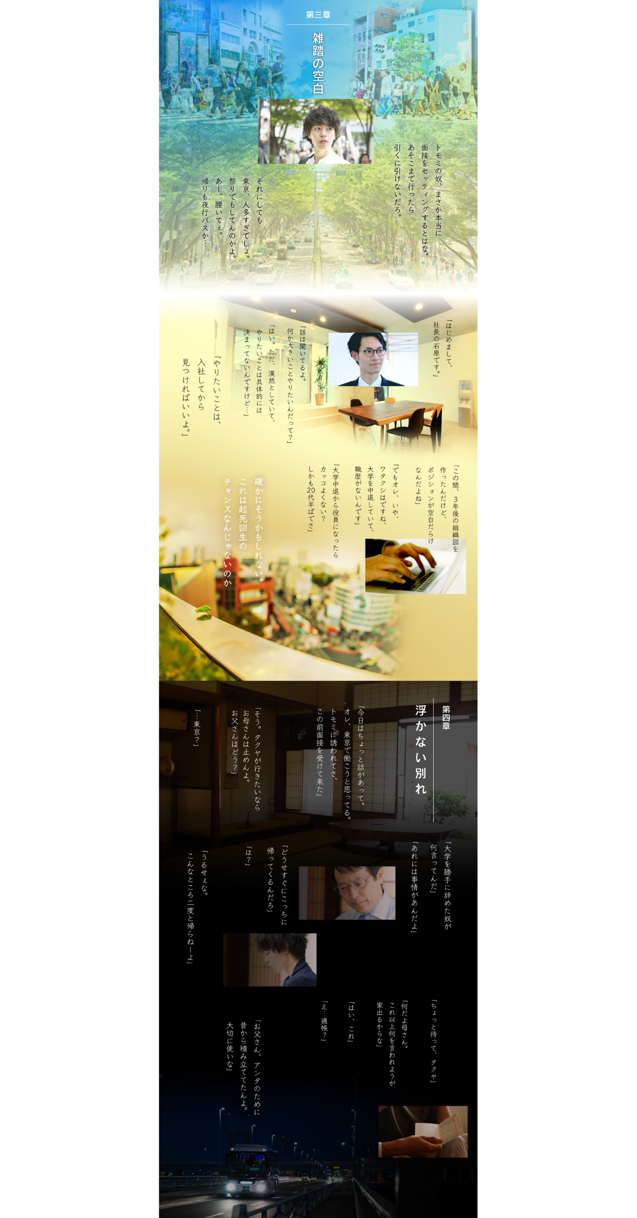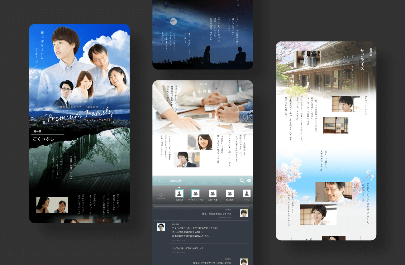 ストーリーの舞台は広島。大学を中退し、仕事も続かない、まだ不安定な23歳のタクヤが主人公です。友人トモミの誘いを転機に、タクヤはpequodの面接を受け、東京への上京と転職を決意します。この時、父親に「大学も勝手にやめたんだ、どうせすぐ帰ってくる」と言われて喧嘩をしたり、一方母親からは「父さん、タクヤのために昔から積み立ててたんよ」と新生活の支えとなる通帳を手渡されたり…、すれ違う親子のリアルな会話・シーンを意識して作成しています。このリアリティにこだわった演出が、導入から求職者の興味を掴んで離さない「没入」と「共感」を生み出しました。