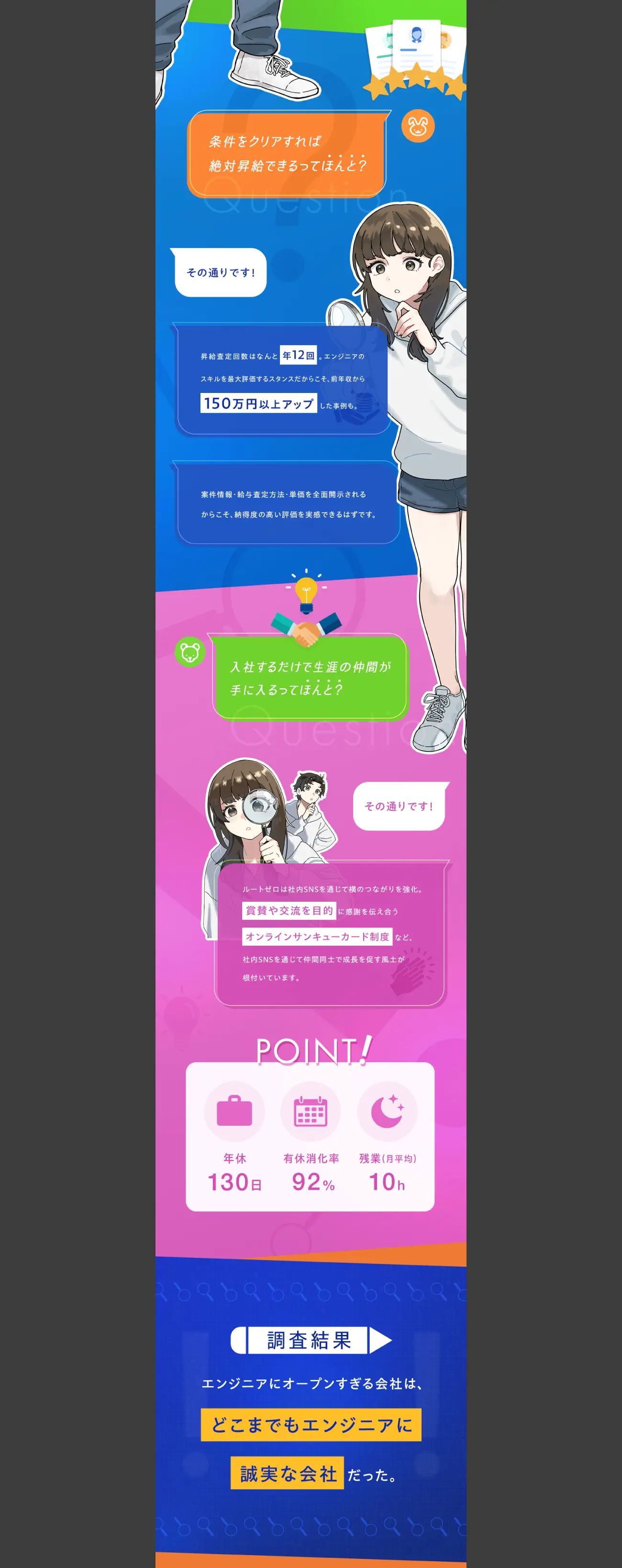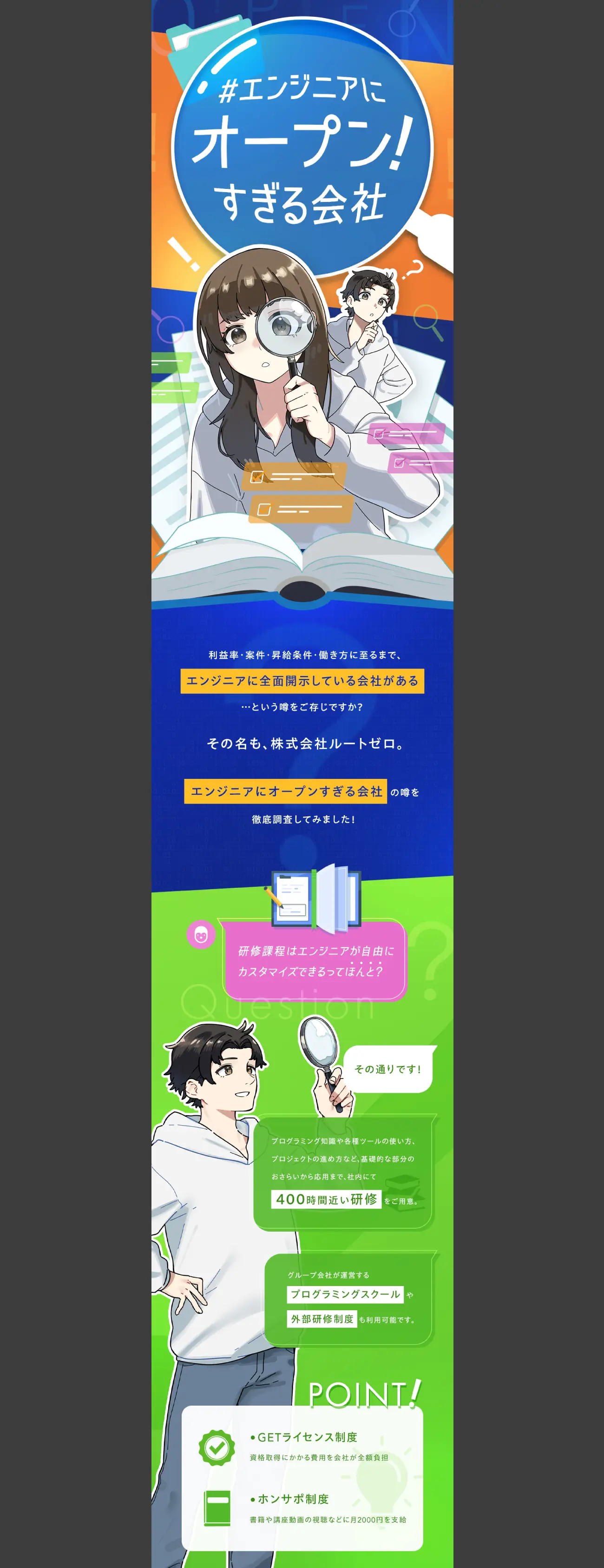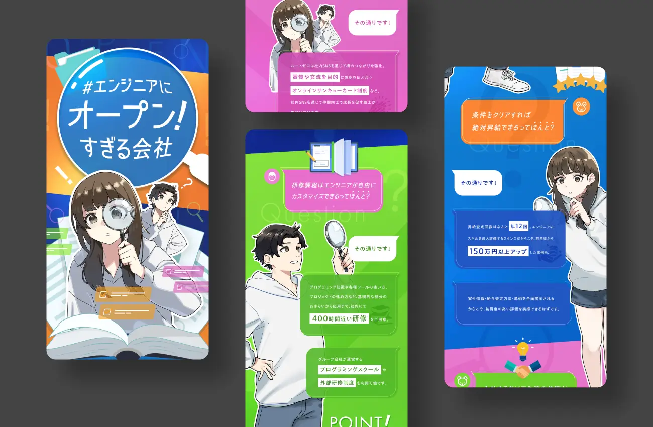 エンジニアに対して何事も“全面開示”を徹底しているルートゼロ様。案件情報や単価、還元率、昇給基準などをすべてオープンにすることで、エンジニアが安心して働ける透明性の高い社内文化を育まれています。これまでは給与や案件利益率などの待遇面を求人広告で訴求していましたが、売り手市場のためどの競合も好条件が当たり前になっており、差別化に苦戦していたそうです。取材ではルートゼロ様の豊富な教育制度や、エンジニアに対する誠実な姿勢などさまざまなお話をお伺いすることができ、待遇面以外でも求職者に魅力を伝えられると確信。そこで提案したのが、“エンジニアにオープンすぎる会社”という打ち出しの広告でした。