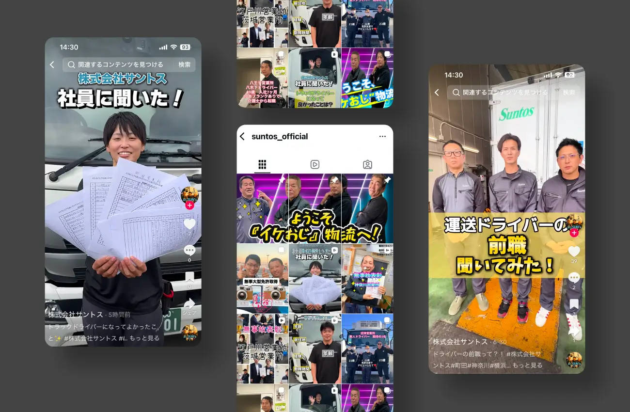 株式会社サントス様は、食品物流を担う運送会社として安定した事業基盤を持つ一方、ドライバー採用においては「応募数の拡大」と「入社後のミスマッチ防止」という、両立が難しい課題を抱えていました。そこでオールインが着目したのが、SNSを活用した採用コミュニケーションの再設計です。TikTok・Instagramを中心に、求人情報だけでは伝わりにくい「仕事のリアル」「職場の空気感」「働く人の姿」をショート動画というフォーマットで可視化。単なる認知拡大ではなく、応募前に不安や疑問を解消することを目的に、企業情報・福利厚生・社員インタビュー・現場の様子などを企画・制作しました。また、月4本以上の動画制作と継続的な投稿を行い、再生数・視聴維持率などの数値をもとに改善を重ねるPDCA型の運用体制を構築。計24本の動画を作成し、「作って終わり」ではなく、勝ちパターンを見つけて伸ばす設計を行いました。