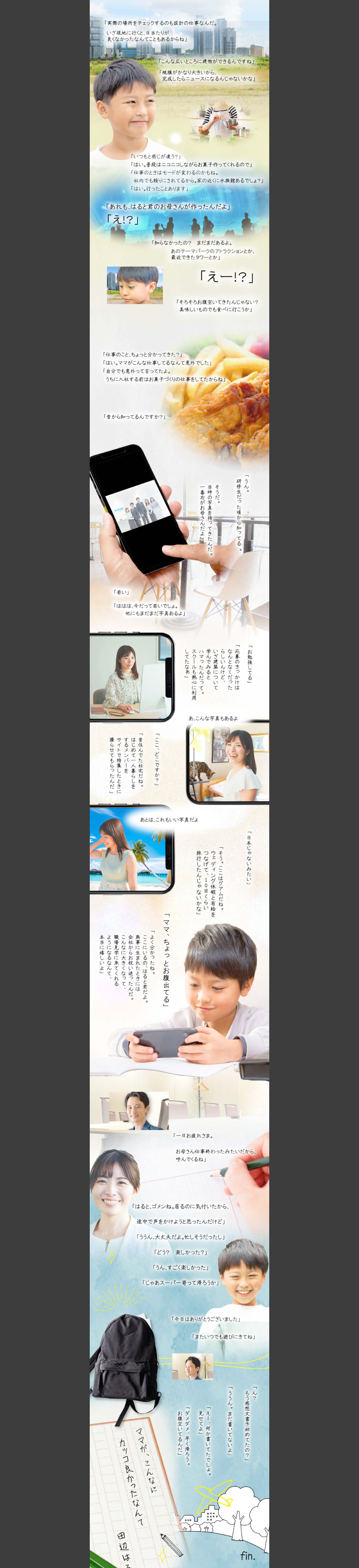 本シナリオでは、人事担当様がガイド役となり、設計職の仕事内容などを解説。現場の視察にも同行し、これまでに多数の有名施設を手掛けていることなど、設計士としての母親の活躍振りを伝えています。また、若かりし頃の母を語るシーンでは、スクールを熱心に利用していたこと、結婚後にウェディング休暇を利用したこと、昔は社宅に住んでいたことなど、会社の特徴を随所に交えた会話を展開。最後には「ママがこんなにカッコ良かったなんて」と子ども目線での憧れを描き、余韻を残すエンディングとしました。