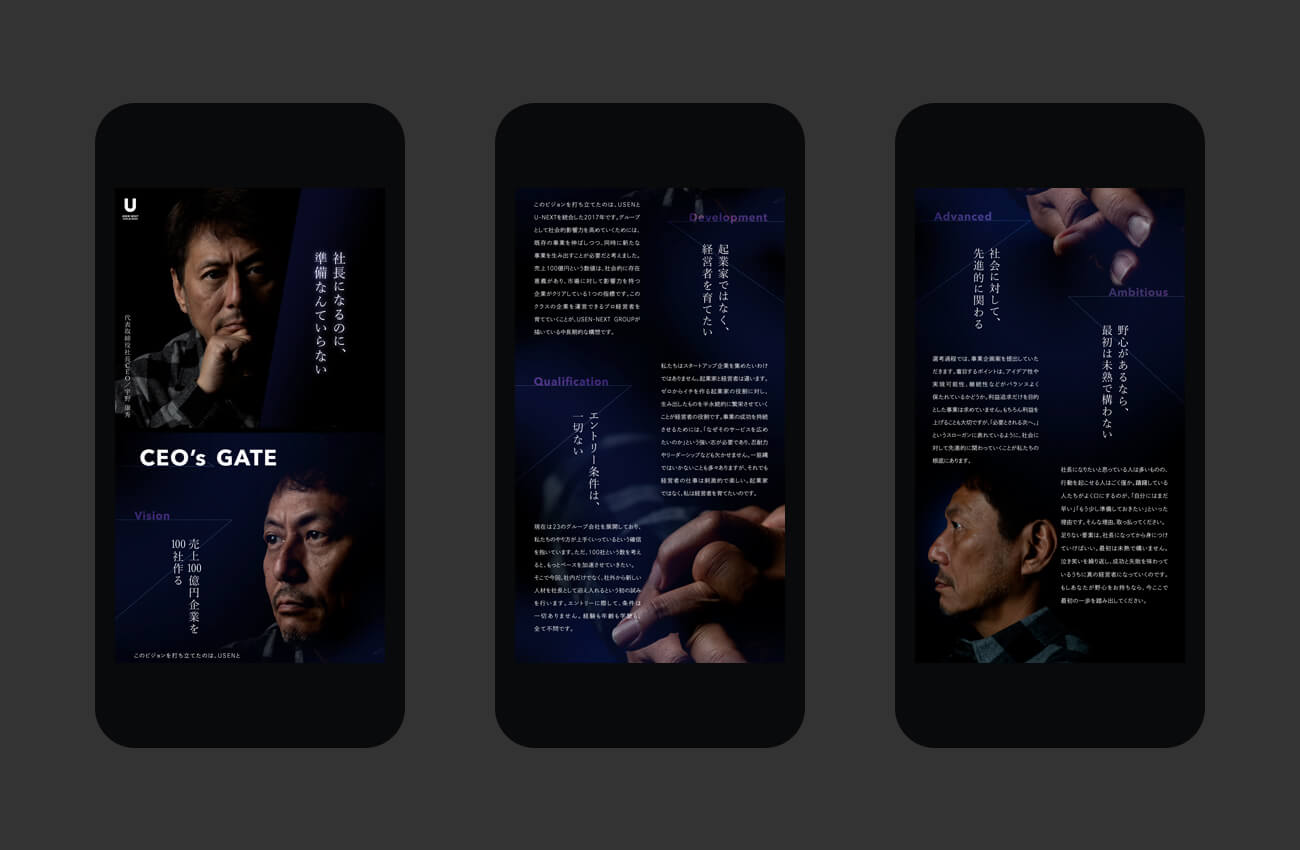 100社の事業会社・100人の社長を生み出す。この壮大なプロジェクトを支援するにあたって、やはり代表取締役社長CEO・宇野様の言葉こそがヒントになると考えました。インタビューを通して広告全体の底流になると感じたのが、「プロ経営者を育てたい」という宇野様の思い。この数年、スタートアップ企業がメディアを賑わせる機会が増えていますが、宇野様のインタビューから見えてきたのは、経営者と起業家は違うということです。端的に言うと、起業家の役割はゼロからイチを作ること、経営者の役割は生み出したものを半永続的に繁栄させていくこと。バイアウトを目的とした短距離ランナーではなく、持久力を備えた長距離ランナーの人材に刺さるよう、重心の低いクリエイティブに仕上げました。